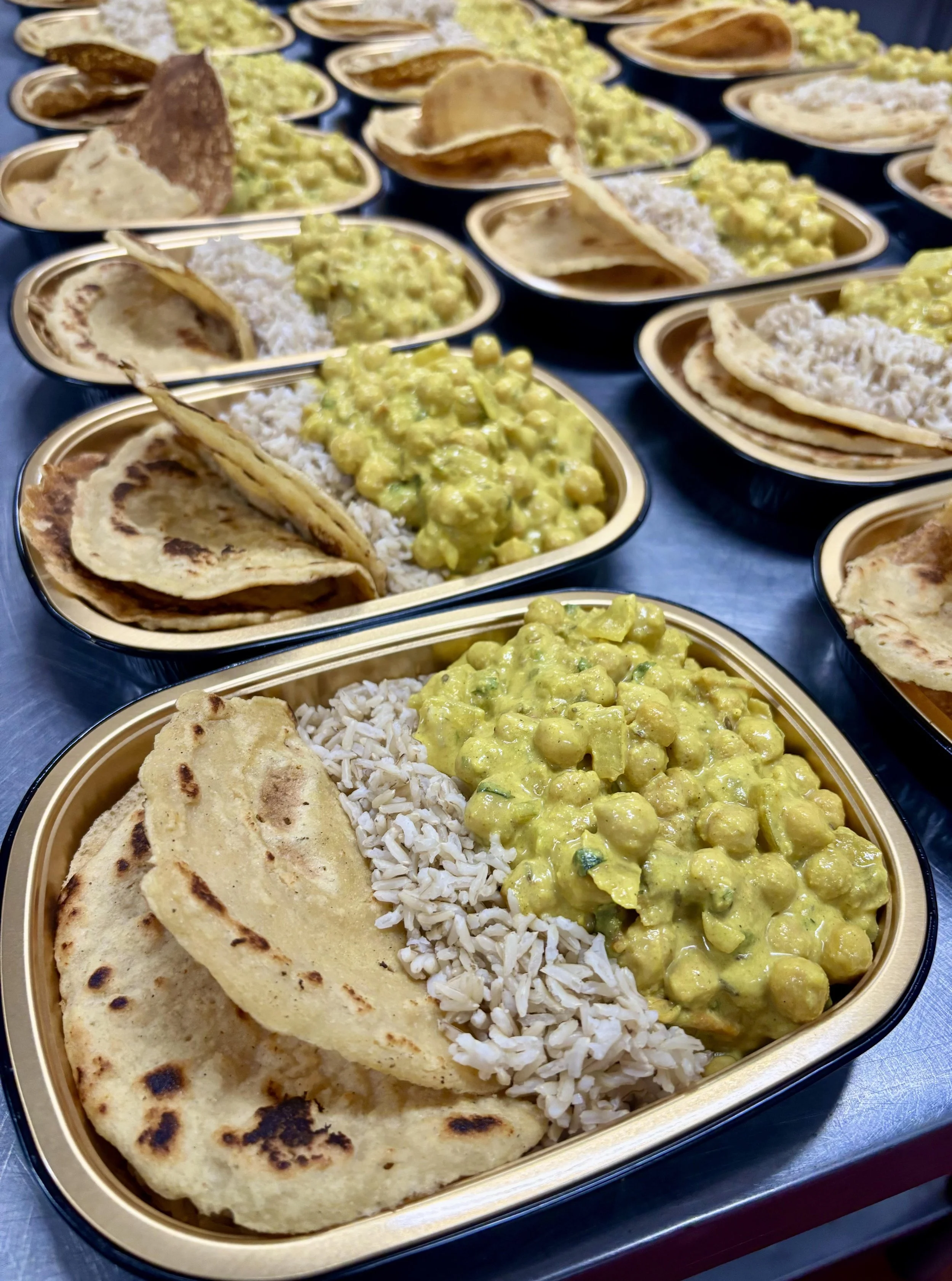 Butter Chickpeas with Quinoa Roti - It’s back! Rich, creamy butter chickpeas simmered in a warm tomato spice sauce. Served with fluffy jasmine rice and soft quinoa roti — a delicious, comforting dish made with good oils and wholesome ingredients. Ingredients: Jasmine rice, quinoa roti (quinoa, chickpea flour, grey salt, filtered water), chickpeas, fresh tomatoes, coriander, garam masala, cumin, fenugreek, coconut milk, grey salt, black pepper)